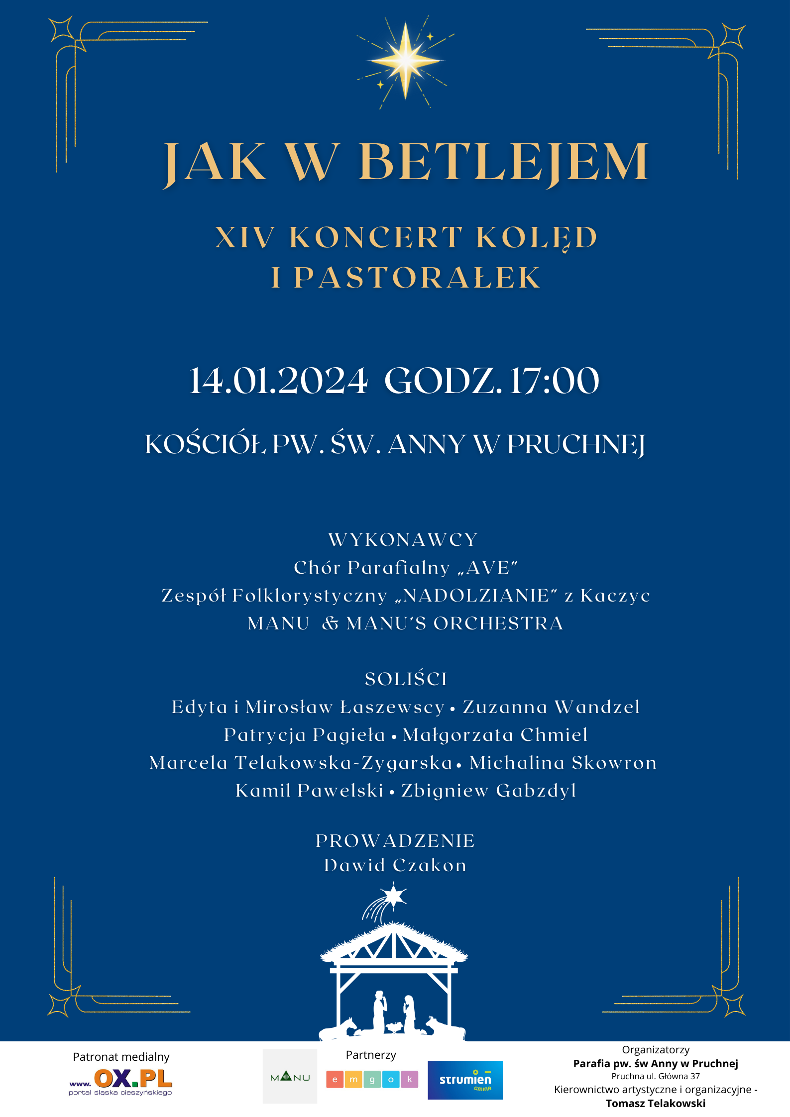 W niedzielę 14 stycznia 2024 r. o godzinie 17:00 w kościele pw. św. Anny w Pruchnej odbędzie się XIV Koncert Kolęd i Pastorałek "Jak w Betlejem".