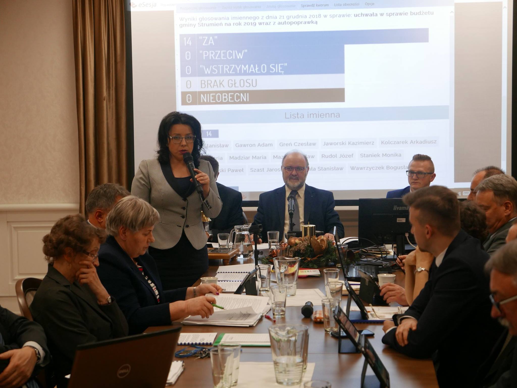 Radni zapoznali się z informacjami o działalności Burmistrza Strumienia Anny Grygierek oraz Przewodniczącego Rady Miejskiej w Strumieniu Czesława Grenia. Zgłaszali również interpelacje, zapytania i wnioski. Podjęli wszystkie uchwały zgodnie z porządkiem obrad. Uchwalono m.in. budżet Gminy na 2019 r. Po zakończeniu Radni przyjęli życzenia od Zespołu Regionalnego "Strumień".