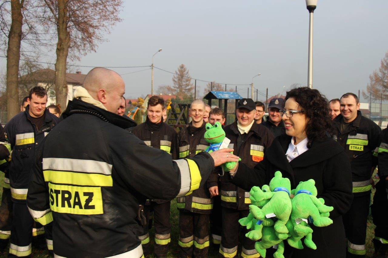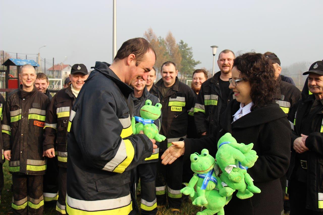 Żabki przekazała jednostkom Burmistrz Strumienia Anna Grygierek. Jak mówią strażacy przyda się w akcjach ratowniczych. - W wozach strażackich będą jeździć żabki z „żabiego kraju”, które nie tylko będą znakiem rozpoznawczym naszych jednostek, ale w razie zdarzenia z udziałem dzieci będą na pewno przydatne. Strażacy będą je mieli w wozach bojowych – mówi Ireneusz Nowak, miejsko-gminny Komendant OSP RP.