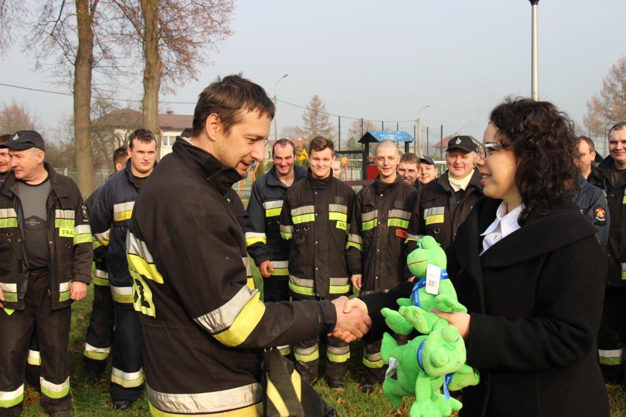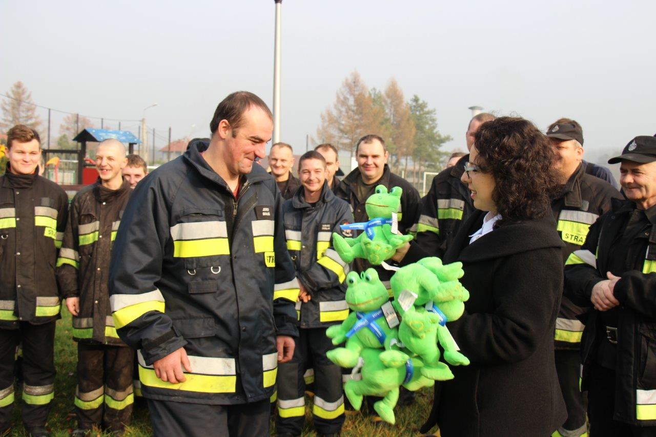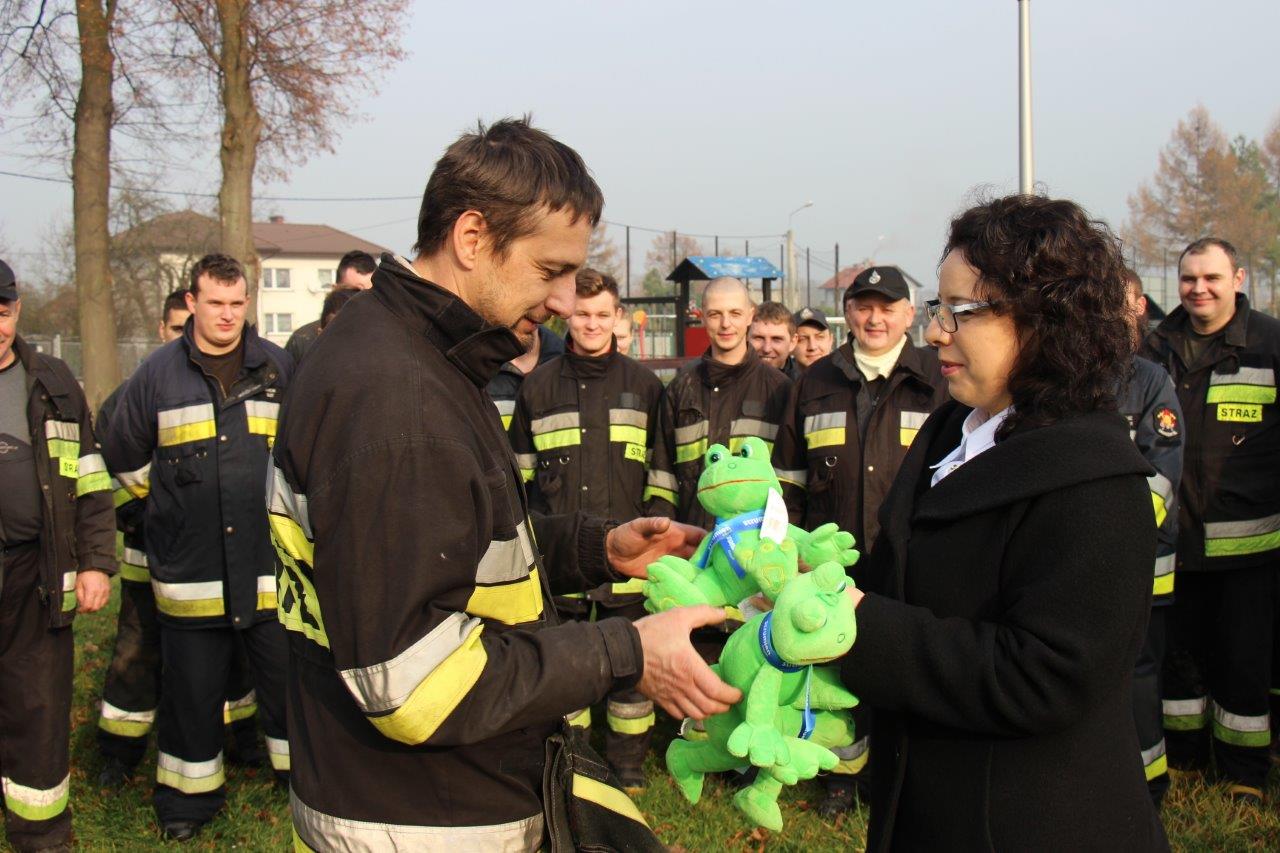 Upominek z gminy Strumień otrzymała również jednostka Państwowej Straży Pożarnej ze Skoczowa. - Maskotki bardzo się przydadzą, używamy je szczególnie w wypadkach komunikacyjnych w sytuacji, gdy w wypadku biorą udział dzieci. Często się zdarza, że jest są zestresowane i płaczą. Kiedyś otrzymywaliśmy takie maskotki z Komendy Wojewódzkiej, a teraz miła niespodzianka ze Strumienia, która na pewno niestety prędzej czy później się przyda. Kiedy dziecko znajdzie się w trudnej sytuacji na pewno się ta żabka będzie pociechą – mówi st.kpt. Dariusz Walek, Dowódca Jednostki Ratowniczo-Gaśniczej w Skoczowie.
