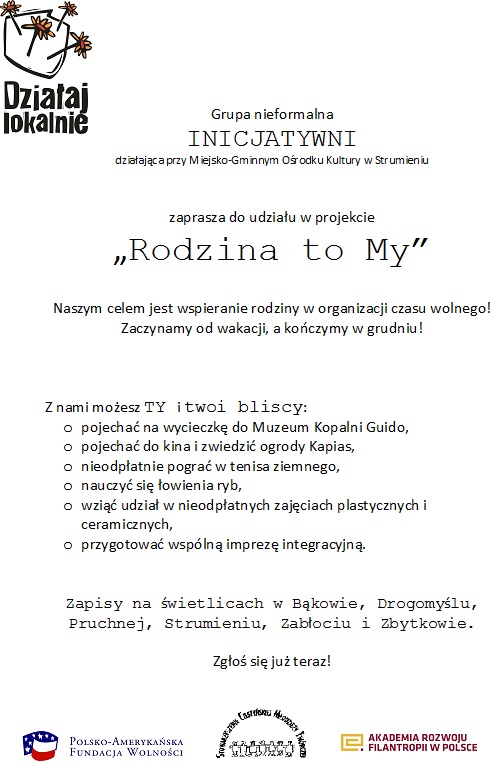 Grupa nieformalna INICJATYWNI działająca przy Miejsko-Gminnym Ośrodku Kultury w Strumieniu zaprasza do udziału w projekcie „Rodzina to My” wspierającym rodziny w organizacji czasu wolnego. Zapisy prowadzone są w świetlicach.
