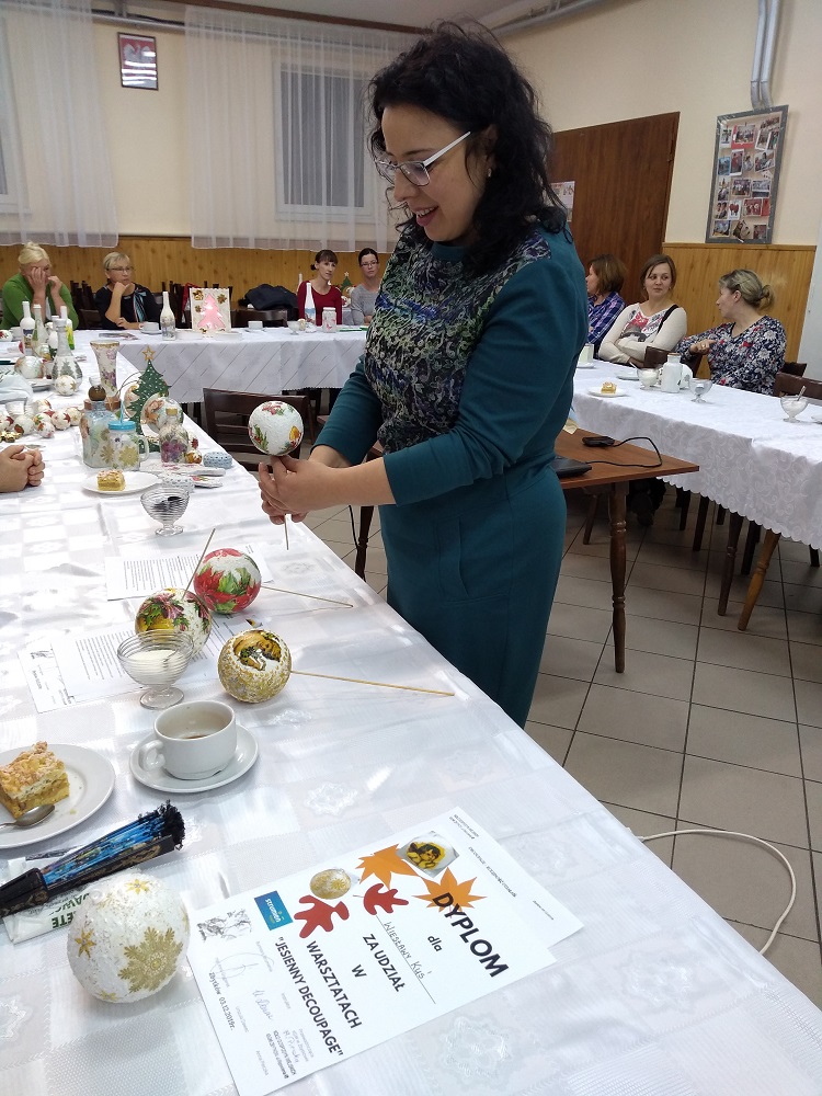Mieszkańcy z terenów gminy Strumień z sołectw Zbytków, Bąków i Pruchna zakończyli cykl warsztatów decoupage, które cieszyły się ogromnym zainteresowaniem. Wstęp na zajęcia był bezpłatny a organizatorem były Koła Gospodyń Wiejskich oraz Gmina Strumień zapewniając niezbędne materiały na potrzeby warsztatów. Wszyscy uczestnicy w długie jesienne wieczory nabywali nowych umiejętności z ozdabiania przedmiotów metodą decoupage. Efektem spotkań są piękne, oryginalne ozdoby świąteczne, które z pewnością zdobią świąteczne domy uczestniczek i ich rodzin.
