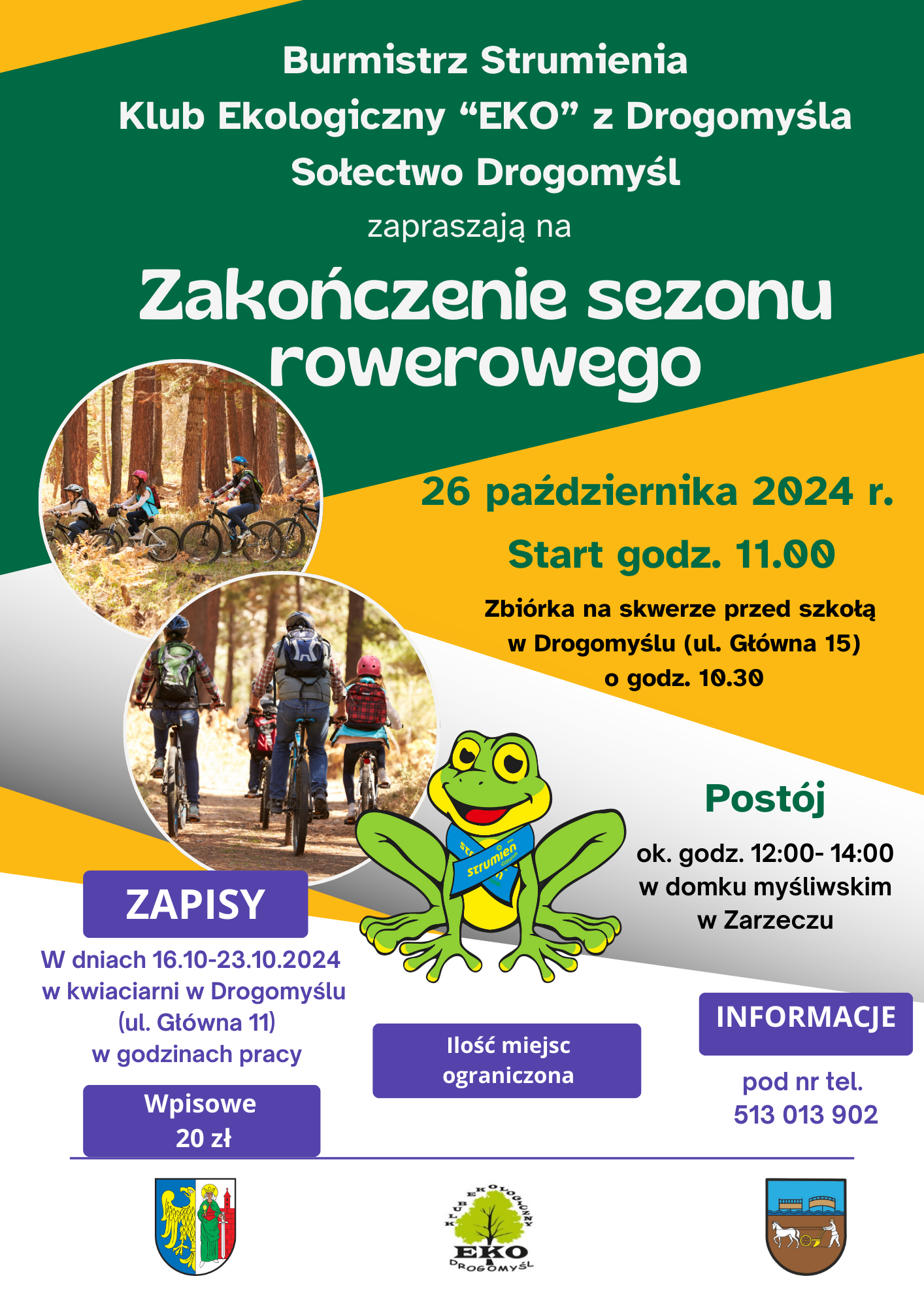Burmistrz Strumienia, Klub Ekologiczny „EKO” z Drogomyśla oraz Sołectwo Drogomyśl zapraszają wszystkich miłośników rowerowych wycieczek na Zakończenie sezonu rowerowego, które odbędzie się 26 października 2024 r.