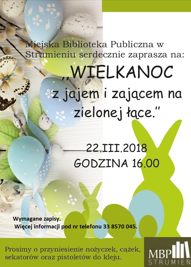 Miejska Biblioteka Publiczna w Strumieniu zaprasza na „Wielkanoc z jajem i zającem na zielonej łące”. Warsztaty odbędą się 22 marca o godzinie 16.00 w bibliotece. Więcej informacji pod numerem telefonu 33 8570 045. Wymagane zapisy. Prosimy o przyniesienie nożyczek, cążek, sekatorów oraz pistoletów do kleju.
