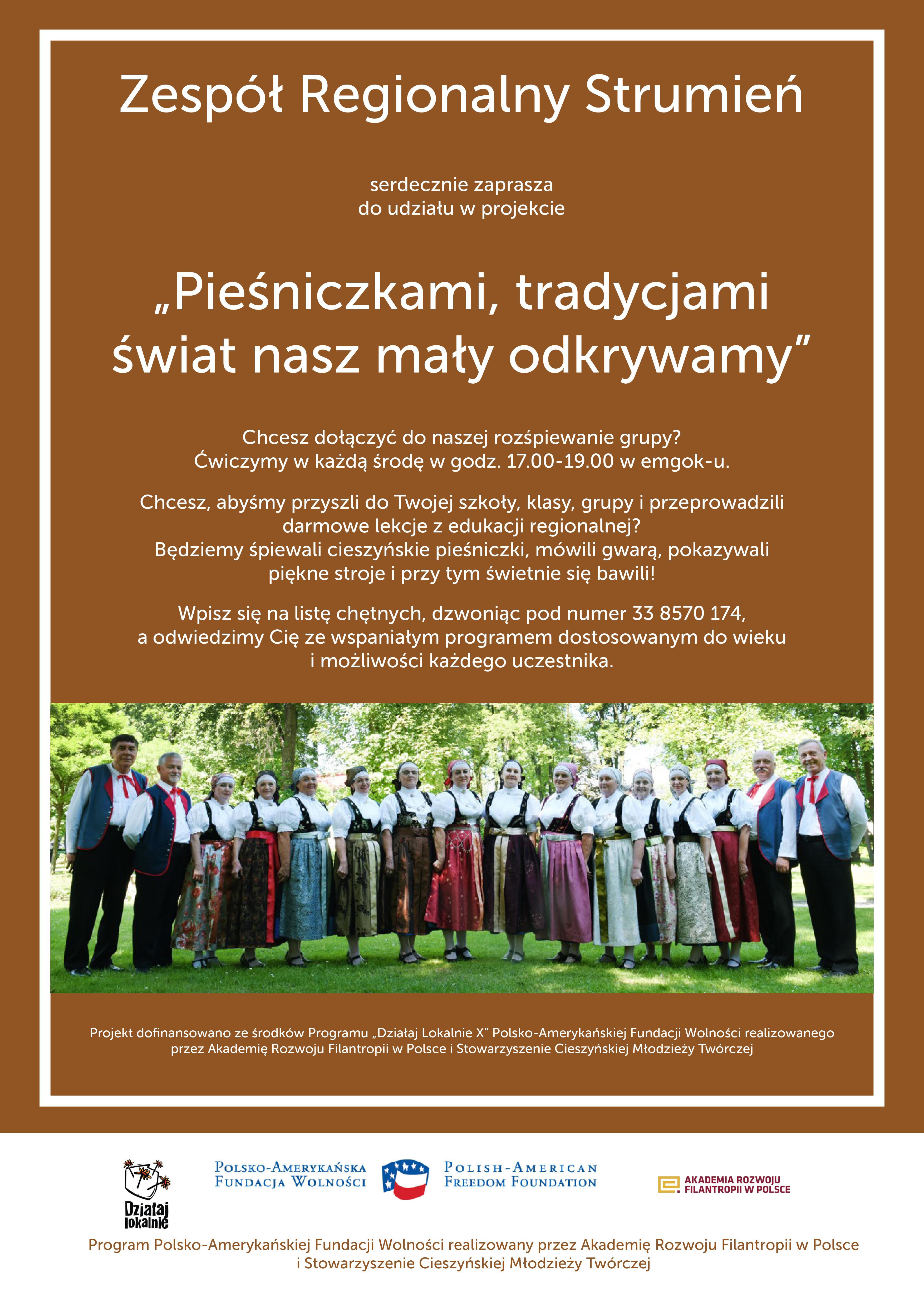 Zespół Regionalny Strumień serdecznie zaprasza do udziału w projekcie "Pieśniczkami, tradycjami świat nasz mały odkrywamy". Chcesz dołączyć do naszej rozśpiewanie grupy? Ćwiczymy w każdą środę w godz. 17.00-19.00 w emgok-u.