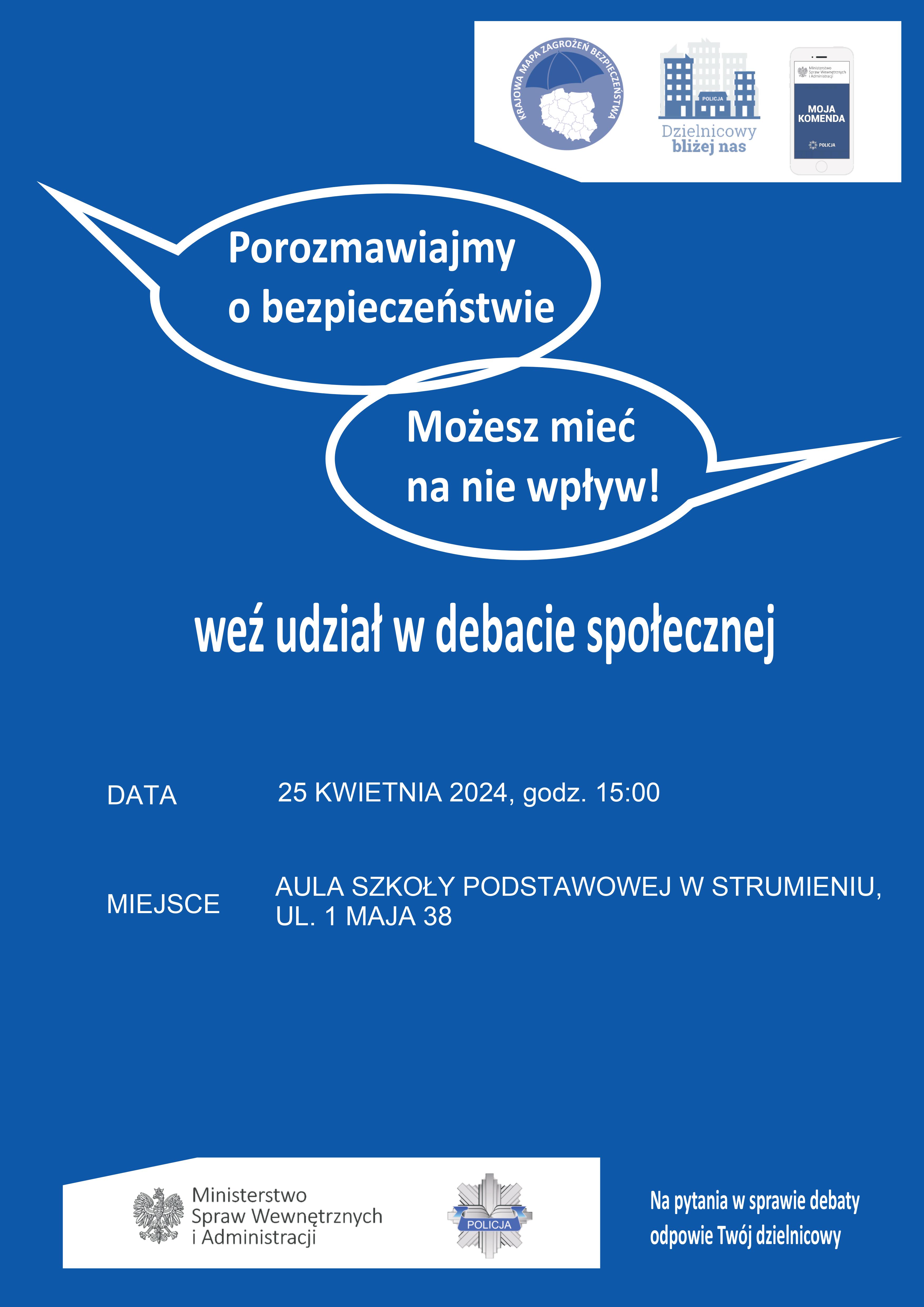 Komenda Powiatowa Policji w Cieszynie przy współpracy z Gminą Strumień zapraszają do wzięcia udziału w debacie ewaluacyjnej "Porozmawiajmy o bezpieczeństwie - możesz mieć na nie wpływ. Bezpieczeństwo nasza wspólna sprawa".
