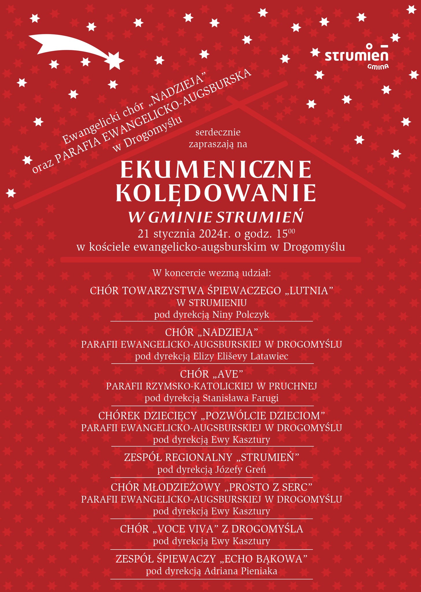 Serdecznie zapraszamy na Ekumeniczne Kolędowanie, które odbędzie się w najbliższą niedzielę 21 stycznia 2024 r. o godzinie 15:00 w Kościele Ewangelicko-Augsburskim w Drogomyślu.