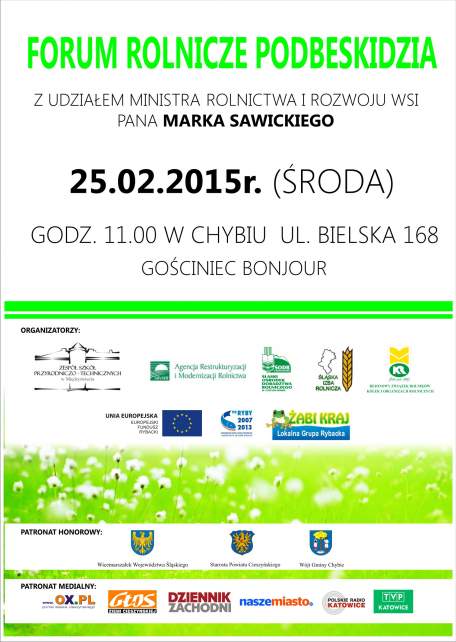 Serdecznie zapraszamy na „Forum Rolnicze Podbeskidzia”,z udziałem Ministra Rolnictwa i Rozwoju Wsi Marka Sawickiego, które odbędzie się 25 lutego 2015 r. o godz. 11:00  w Gościńcu BONJOUR w Chybiu, ul. Bielska 168