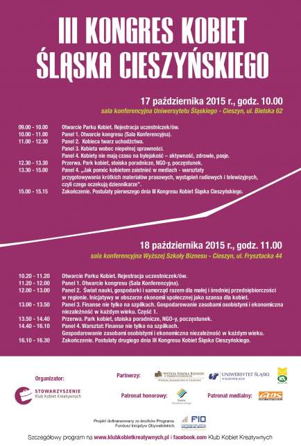 Serdecznie zapraszamy do udziału w III Kongresie Kobiet Śląska Cieszyńskiego, który odbędzie się w dniach 17-18 października w Cieszynie. Organizatorem Kongresu jest Klub Kobiet Kreatywnych. Wydarzenie jest platformą wyrażenia poglądów i dyskusji wśród kobiet i o kobietach.