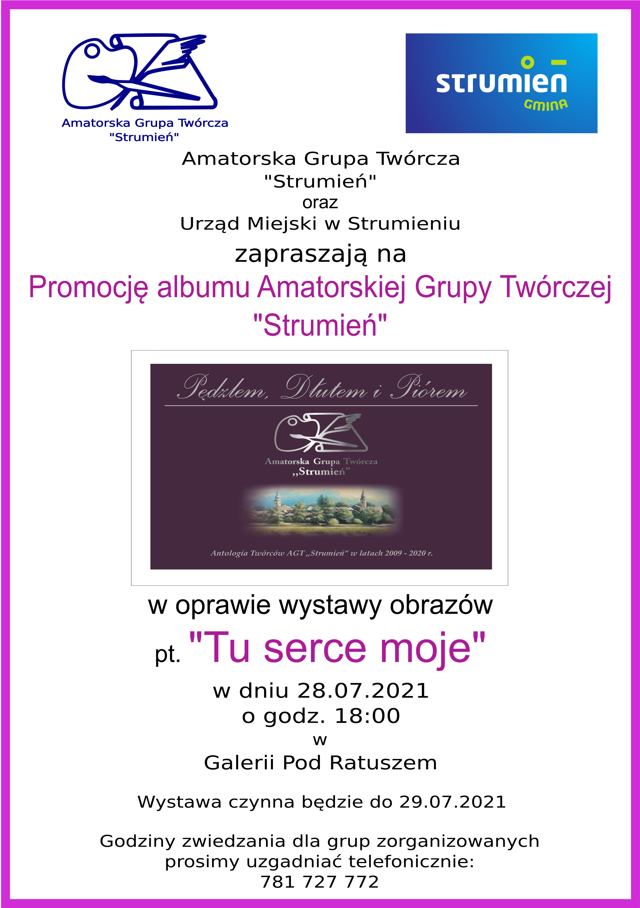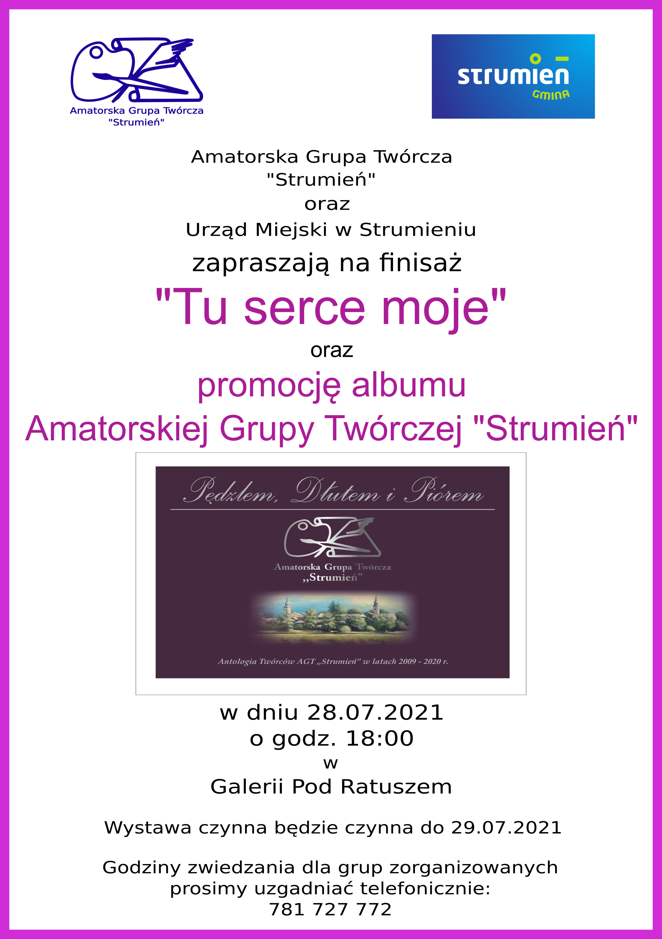 Urząd Miejski w Strumieniu oraz Amatorska Grupa Twórcza "Strumień" zapraszają na promocję albumu Amatorskiej Grupy Twórczej "Strumień" pt. "Pędzlem, dłutem i piórem". Jest to antologia twórców AGT „Strumień” aktywnych w latach 2009-2020.
