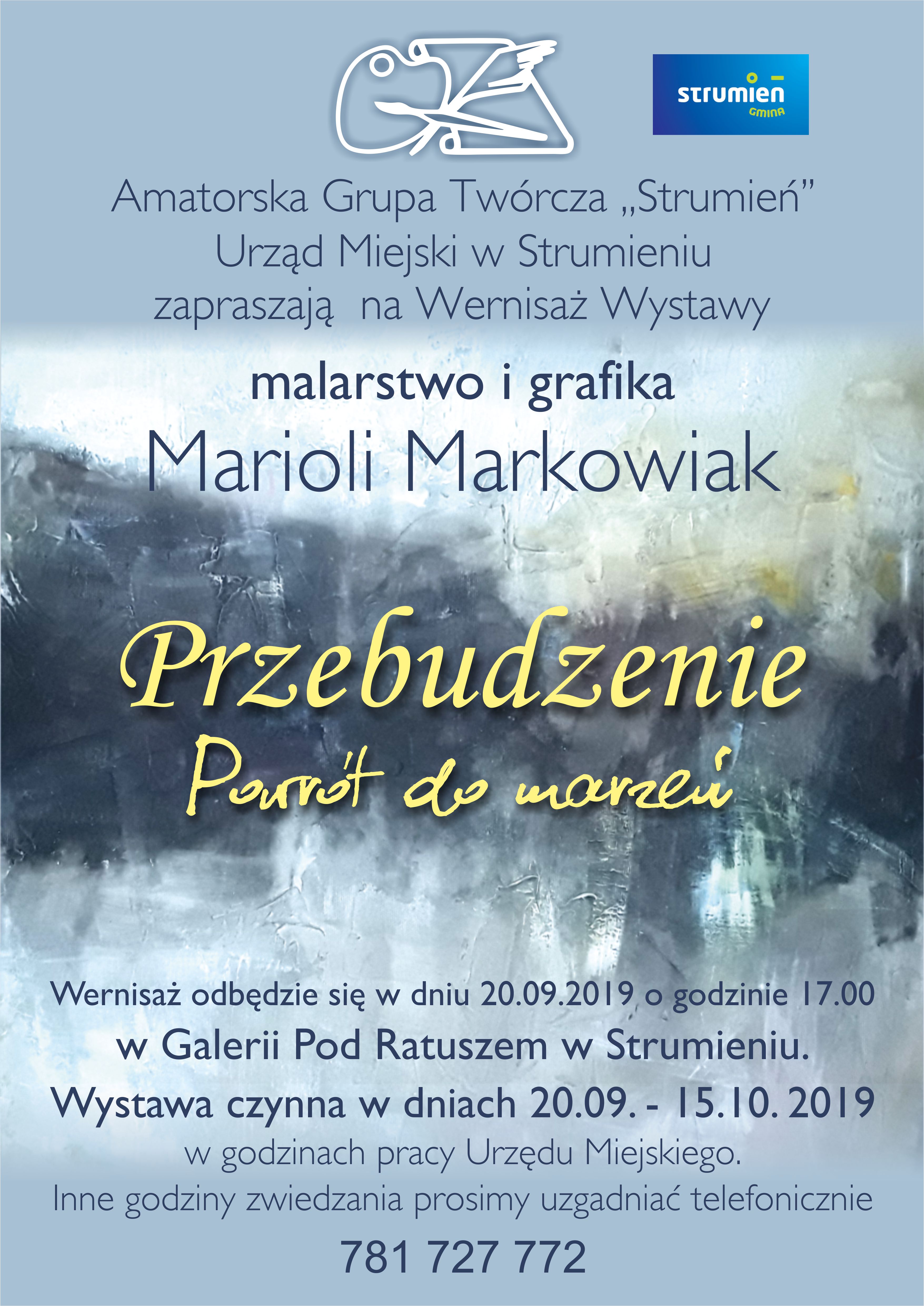 Amatorska Grupa Twórcza „Strumień oraz Urząd Miejski w Strumieniu zapraszają na wernisaż wystawy malarstwa i grafiki Marioli Markowiak „Przebudzenie powrót do marzeń”.