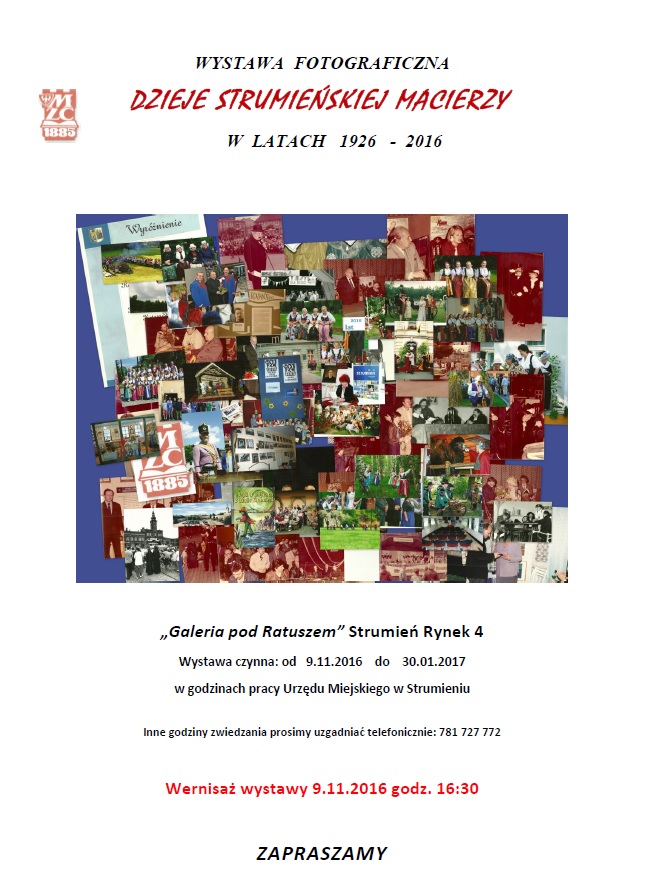 Już w środę 9.11.2016r. w Galerii Pod Ratuszem w Strumieniu odbędzie się wernisaż wystawy fotograficznej „Dzieje Strumieńskiej Macierzy w latach 1926 -2016”. Wernisaż rozpocznie się o godz. 16.30. Wystawę będzie można zwiedzać do 30 stycznia 2017r. w godzinach pracy Urzędu Miejskiego w Strumieniu. Inne godziny zwiedzania prosimy uzgadniać telefonicznie: 781 727 772 lub 33 85 70 182
