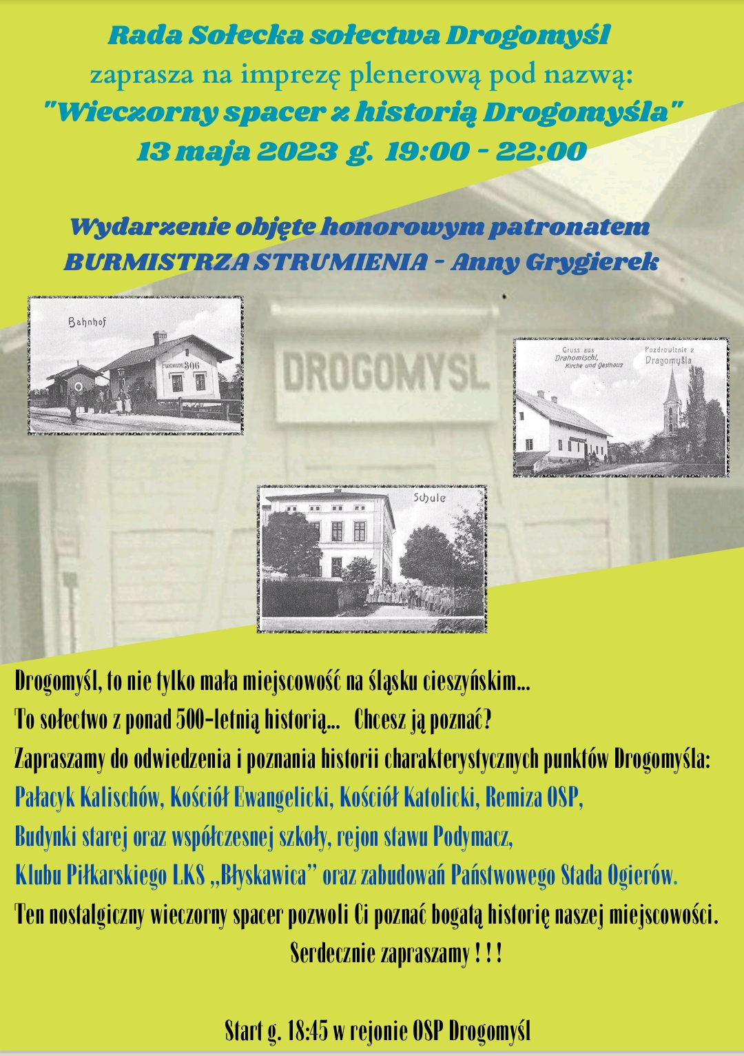 Do udziału w spacerze zaprasza organizator Rada Sołecka sołectwa Drogomyśl. Wydarzenie objęła honorowym patronatem Burmistrz Strumienia Anna Grygierek.