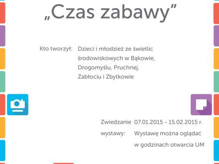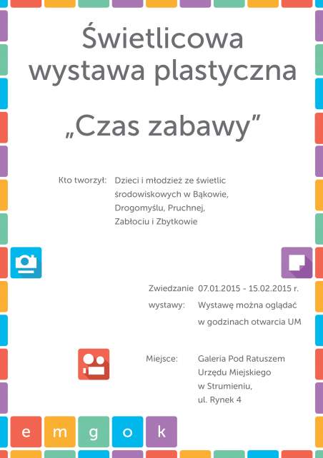 Zapraszamy na świetliową wystawę plastyczną pt. "Czas zabawy". Autorami prezentowanych prac są dzieci i młodzież ze świetlic środowiskowych w Bąkowie, Drogomyślu, Pruchnej, Zabłociu i Zbytkowie. Wystawę można oglądać w dniach 7.01-15.02.2015r. w Galerii pod Ratuszem w Strumieniu, w godzinach pracy Urzędu Miejskiego.