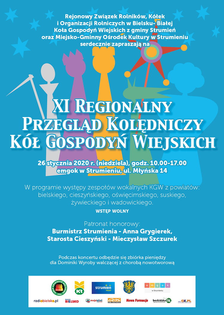 Rejonowy Związek Rolników, Kółek i Organizacji Rolniczych w Bielsku- Białej, Koła Gospodyń Wiejskich z gminy Strumień oraz Miejsko-Gminny Ośrodek Kultury w Strumieniu serdecznie zapraszają na XI Regionalny Przegląd Kolędniczy Kół Gospodyń Wiejskich, który odbędzie się 26 stycznia 2020 r. (niedziela), godz. 10.00-17.00 w emgoku w Strumieniu, ul. Młyńska 14.