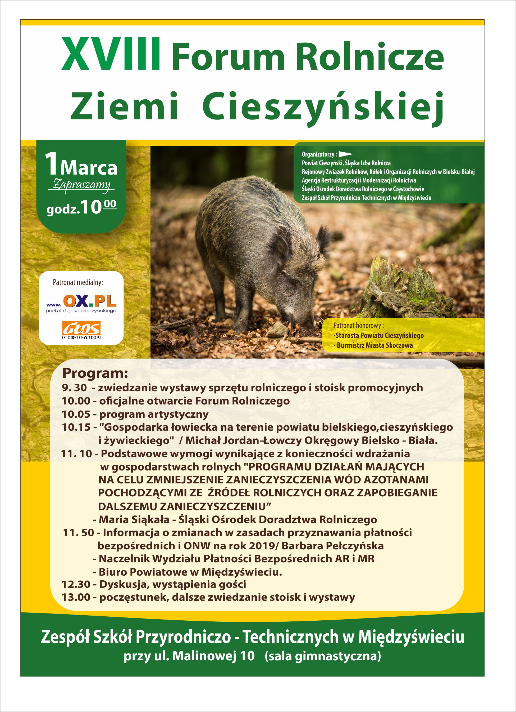 Organizatorzy XVIII Forum Rolniczego Ziemi Cieszyńskiej mają zaszczyt zaprosić na " XVIII Forum Rolnicze Ziemi Cieszyńskiej ", które odbędzie się 1 marca 2019r. w Zespole Szkół Przyrodniczo-Technicznych w Międzyświeciu przy ul. Malinowej 10 ( sala gimnastyczna)