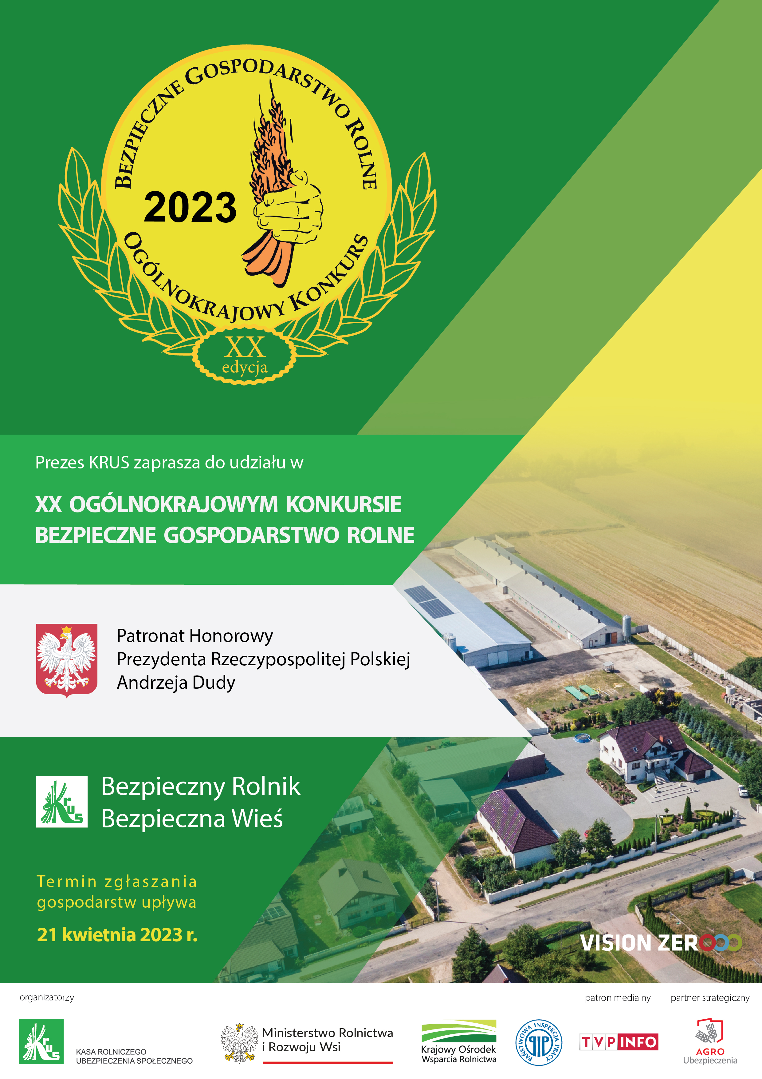 Kasa Rolniczego Ubezpieczenia Społecznego zaprasza właścicieli gospodarstw rolnych, małych jak i dużych, do wzięcia udziału w XX edycji Ogólnokrajowego Konkursu „Bezpieczne Gospodarstwo Rolne”. Patronat honorowy nad konkursem objął Prezydent RP Andrzej Duda.