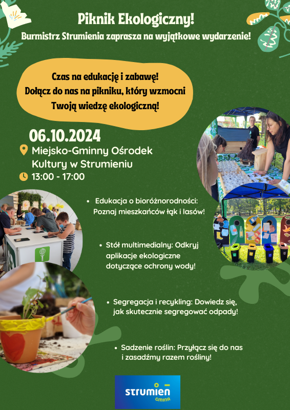 Burmistrz Strumienia zaprasza dzieci, młodzież oraz dorosłych na warsztaty z zakresu ochrony środowiska, które zostaną przeprowadzone w dniu 6 października 2024 r. w godzinach 13.00-17.00 na terenie Miejsko-Gminnego Ośrodka Kultury w Strumieniu przy ul. Młyńskiej 14.