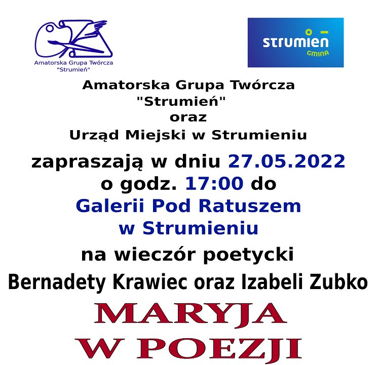 Urząd Miejski w Strumieniu oraz Amatorska Grupa Twórcza „Strumień” serdecznie zaprasza na wieczór poetycki Bernadety Krawiec oraz Izabeli Zubko pt. „Maryja w Poezji”.
